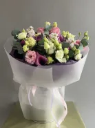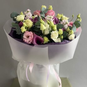 Букет представляет собой элегантную композицию из розовых, белых и зеленых цветов, дополненную свежими листьями эвкалипта. Нежные оттенки бутонов и изящная упаковка придают букету воздушность и утонченность. Идеальный выбор для любого торжества, он обязательно произведет неизгладимое впечатление.