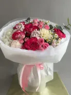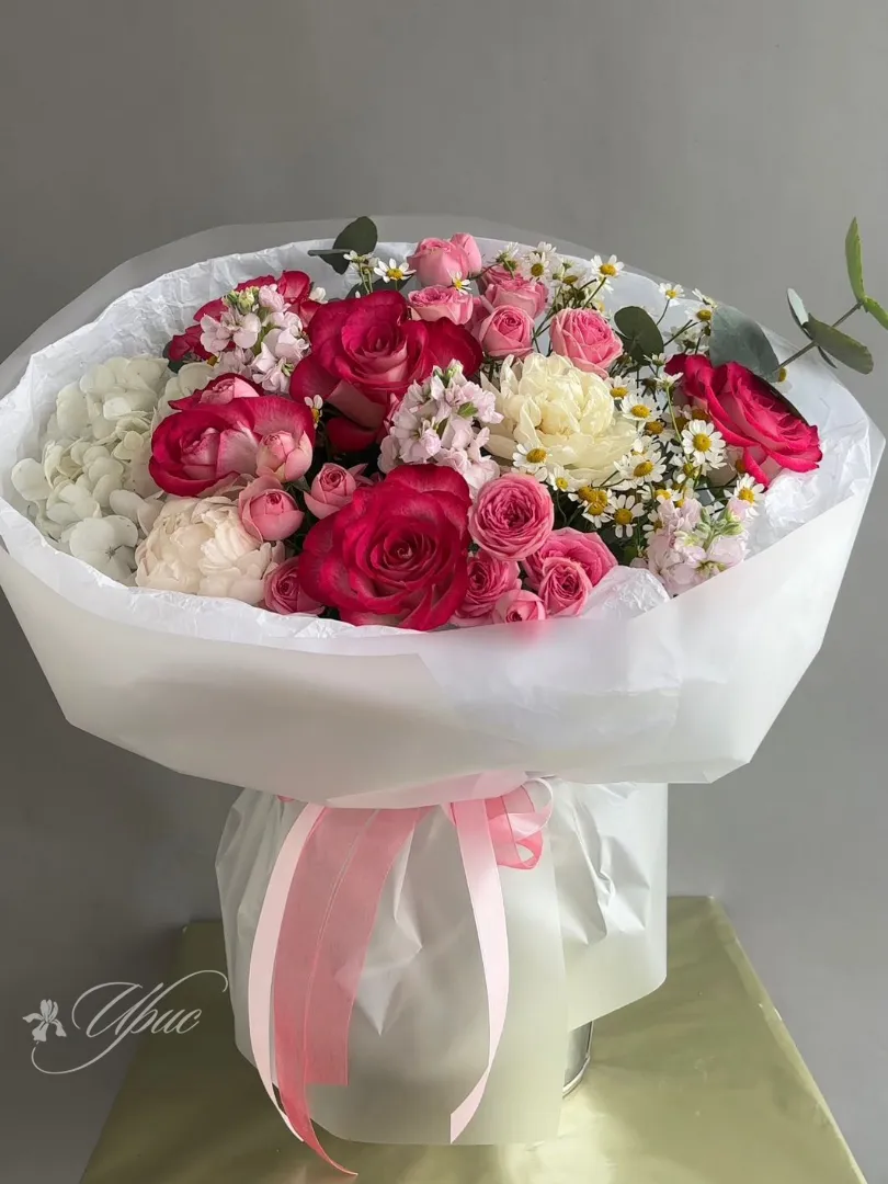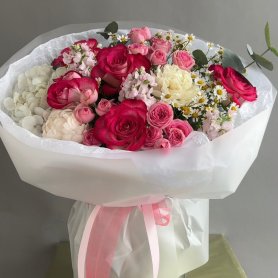 Букет из роз, маттиолы и ромашек, элегантно упакованный в белую бумагу с нежной розовой лентой. Нежные оттенки белых, розовых и ярких розовых цветов создают романтичный и трогательный образ, идеально подходящий для выражения любви и нежных чувств. Этот букет станет прекрасным подарком для самых дорогих и близких.