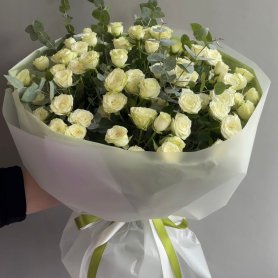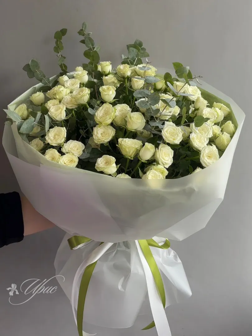Букет, состоящий из нежных белых роз и элегантных ветвей эвкалипта, завернутый в белую бумагу с изящной зелёной и белой лентой, создаёт образ воздушности и чистоты. Этот букет идеально подходит для выражения светлых чувств и торжественных моментов. Простота и элегантность делают его универсальным подарком для любого случая.