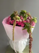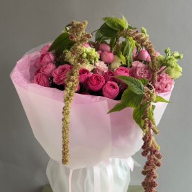 Нежный букет в розовых тонах, сотканный из пышных роз и цветущего амаранта, станет прекрасным подарком для самых дорогих людей. Гармония цветов и форм в этом букете создает атмосферу уюта и элегантности. Букет станет изысканным украшением любого интерьера или особым знаком внимания.
