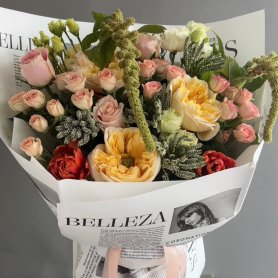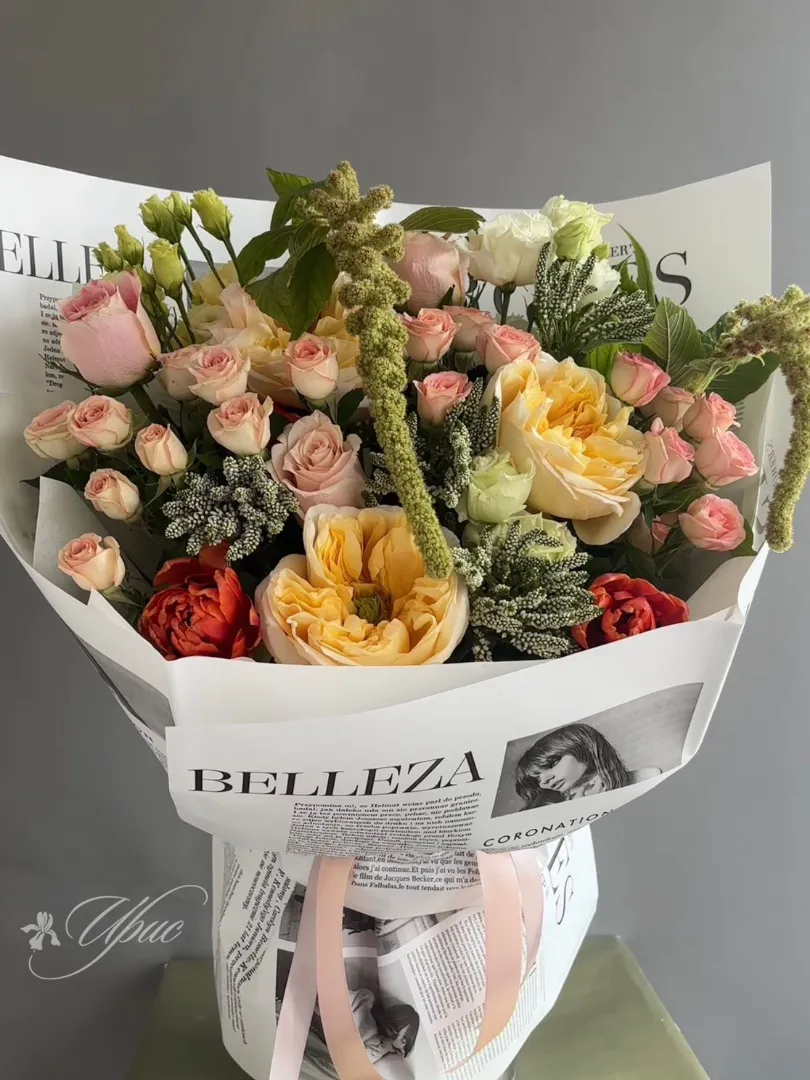 Букет из пионовидных роз и других декоративных растений, элегантно упакованный в бумагу с оригинальным принтом. Нежные оттенки цветов и стильная упаковка создают трогательный образ, идеально подходящий для выражения признательности и любви. Этот букет станет прекрасным подарком для близких и дорогих людей.