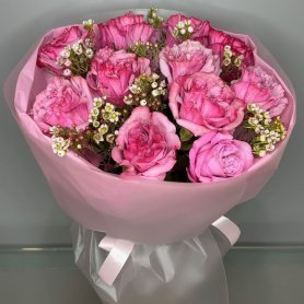 Букет из розовых роз и ароматного хамелациума, завернутый в нежную розовую бумагу с сатиновой лентой, выглядит воздушно и элегантно. Пышные розовые розы сочетаются с мелкими белыми цветами, создавая романтичный и трогательный образ. Этот букет станет прекрасным подарком.