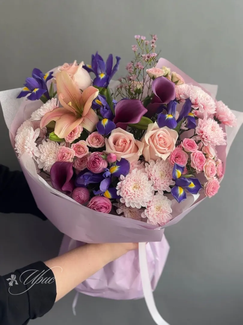 Букет представляет собой гармоничное сочетание розовых и фиолетовых оттенков, создавая нежный и элегантный образ. В его состав входят разнообразные цветы, включая розы, лилии, гвоздики и ирисы, что придает композиции объем и текстуру. Этот букет станет прекрасным подарком для любого торжества, выражая нежные чувства и восхищение.