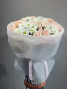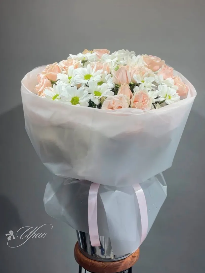 Нежный букет, сочетающий элегантные розовые розы и свежие белые ромашки, упакован в полупрозрачную белую бумагу с изящной светло-розовой лентой. Композиция излучает легкость и воздушность, создавая впечатление летнего настроения. Этот букет идеально подходит для выражения нежных чувств и создания романтичной атмосферы.