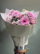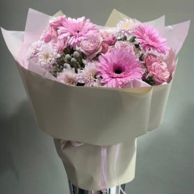Нежный букет, созданный из мягких розовых оттенков, включает в себя розы, герберы и хризантемы, создавая воздушную и романтичную композицию. Этот букет идеально подходит для выражения любви и признательности. Лаконичная упаковка подчеркивает свежесть и красоту цветов.