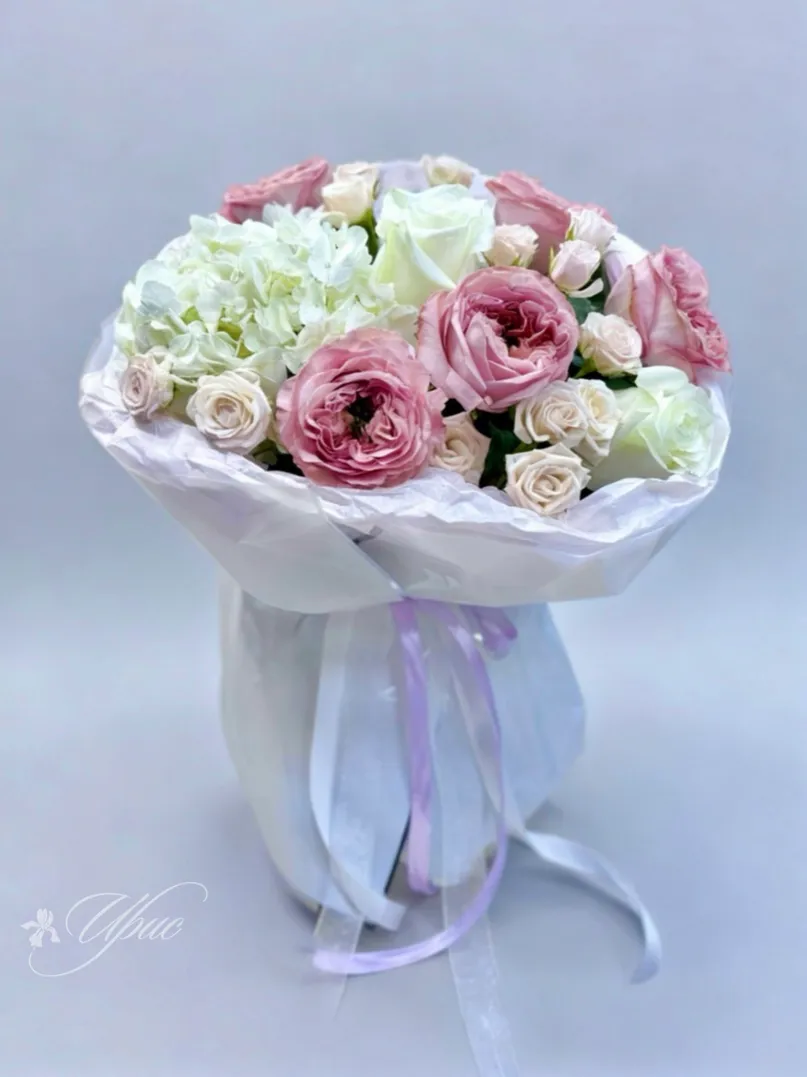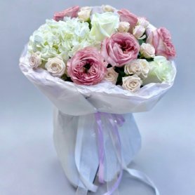 Описание букета Нежный букет, созданный из белых роз и гортензий, выглядит элегантно и воздушно. Белая упаковка с атласной лентой лавандового оттенка подчеркивает свежесть и изящество композиции. Этот букет идеально подходит для выражения светлых чувств и знаков внимания.