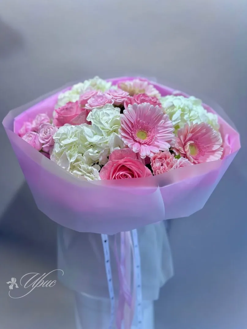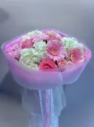 Букет цветов выполнен в мягкой пастельной гамме - в нем сочетаются розовые розы, белые гвоздики и нежные герберы. Благодаря воздушной упаковке букет смотрится легко и невесомо. Этот букет станет прекрасным подарком для близкого человека.
