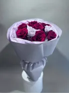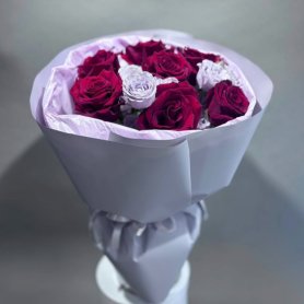 Букет из бордовых роз с добавлением белых цветов, элегантно упакованный в светло-серую бумагу, создает впечатление изысканности и романтики. Этот букет станет прекрасным подарком для особых моментов.