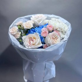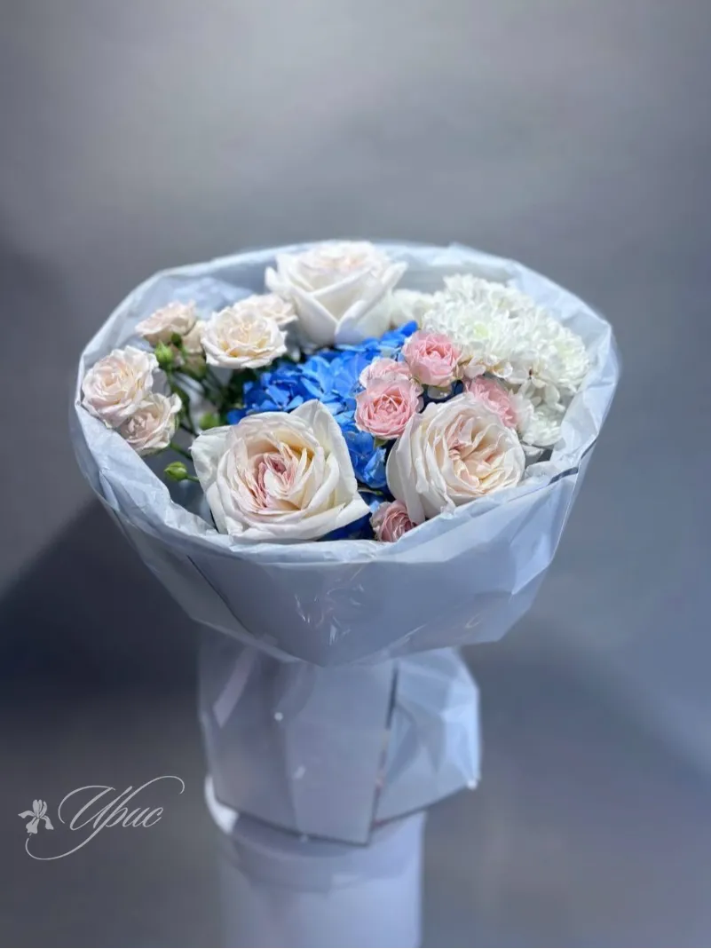 Букет, представленный на фотографии, представляет собой гармоничное сочетание белых роз, голубых гортензий и нежно-розовых бутонов, создавая элегантный и трогательный образ. Нежные оттенки цветов прекрасно дополняют друг друга, придавая композиции воздушность и свежесть. Этот букет станет прекрасным подарком для любого торжества, выражая нежность и элегантность.