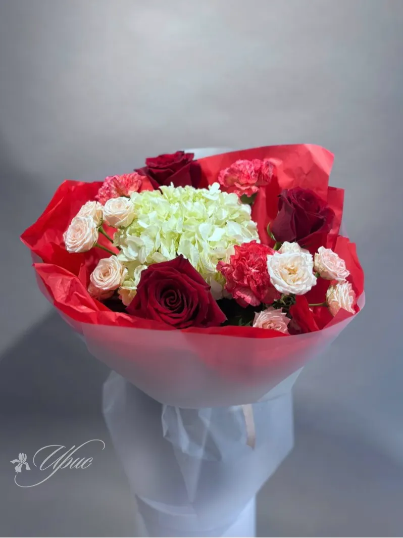 Букет «Романтика» - это изящное сочетание красных роз, белых гортензий и нежных розовых гвоздик, создающее атмосферу любви и элегантности. Белые акценты придают композиции свежесть и воздушность, а яркие акценты делают букет выразительным. Этот букет станет идеальным подарком для самых дорогих и близких людей.