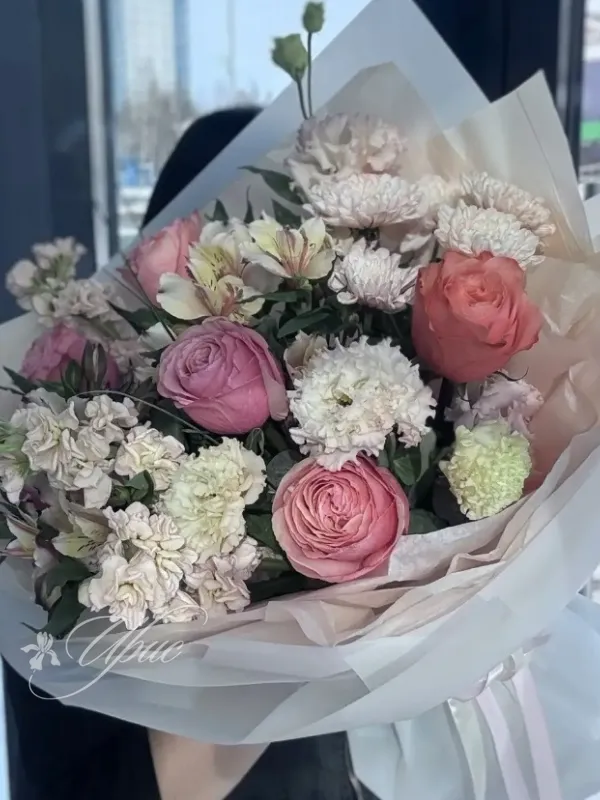 Нежный букет, словно сотканный из весенних снов, с акцентами коралловых и розовых роз, дополненный воздушными маттиолой и альстромерией. Это воплощение элегантности и свежести, идеально подходящее для любого торжества.