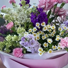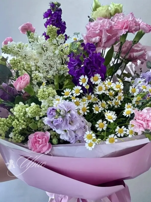 Вот краткое описание букета, идеально подходящее для каталога цветов: Нежный и воздушный букет, в котором гармонично сочетаются оттенки сиреневого, розового и белого. Он словно соткан из летних цветов, излучая свежесть и утонченность. Этот букет станет прекрасным выражением ваших самых искренних чувств.