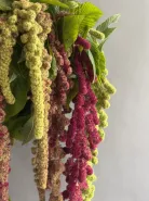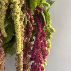 Букет, составленный из амарантов с яркими свисающими соцветиями и насыщенной зеленью листьев, создает элегантный и необычный образ. Длинные соцветия в оттенках от мягкого зеленого до глубокого бордового придают композиции объем и текстуру. Этот букет станет прекрасным акцентом для любого интерьера, добавляя природную красоту и изящество.