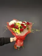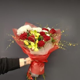 Букет, представленный на изображении, это яркая и изысканная композиция, в которой гармонично сочетаются разнообразные цветы. Основными элементами являются крупные желтые хризантемы, глубокие бордовые розы и элегантные белые гвоздики, дополненные желтыми тюльпанами и изящными веточками с мелкими золотистыми цветками. Аранжировка выполнена в сдержанной цветовой гамме, подчеркивающей естественную красоту цветов и создающей атмосферу тепла и изящества, что делает букет отличным выбором для любого торжественного случая.