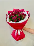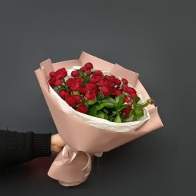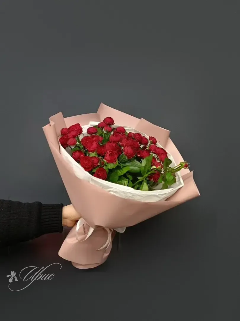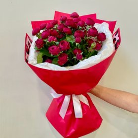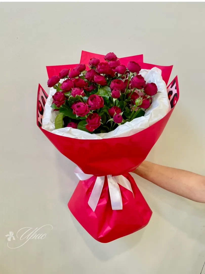 Описание букета Нежный букет из 25 кустовых роз глубокого бордового цвета, аккуратные бутоны которых ещё не полностью раскрылись, станет прекрасным подарком для самых близких людей. Сдержанная красная упаковка с атласной лентой добавляет букету элегантности. Другое возможное описание Букет из 25 бордовых кустовых роз, завёрнутый в красную упаковку с атласной лентой, станет прекрасным выражением чувств и внимания.