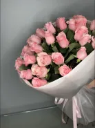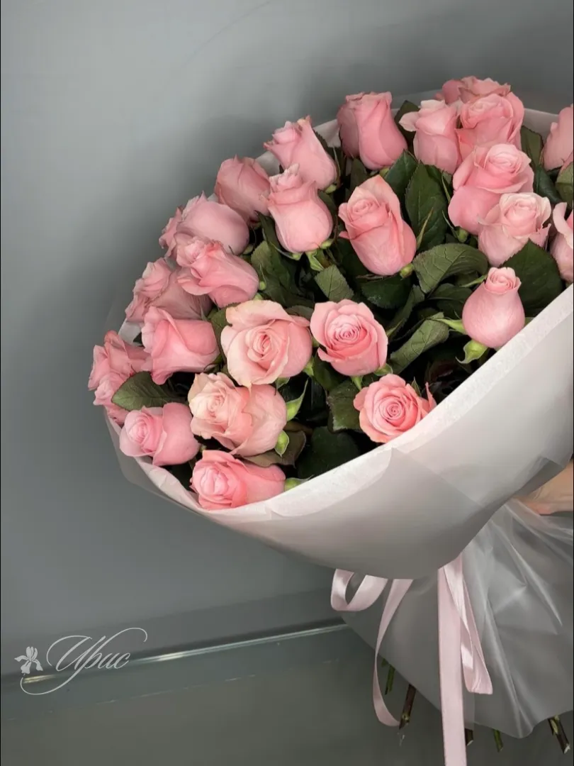 Букет из нежно-розовых роз, элегантно упакованный в белую бумагу и перевязанный атласной лентой, излучает тепло и нежность. Соцветия роз аккуратно собраны в гармоничную композицию, подчеркивающую их природную красоту. Этот букет станет прекрасным подарком для самых дорогих людей.
